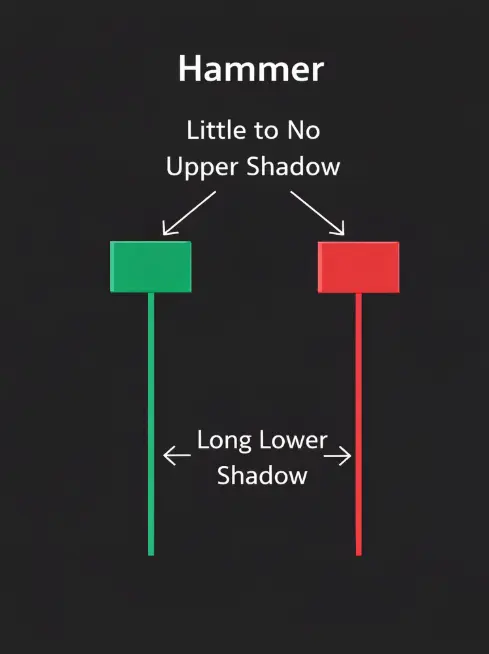 A Hammer is a bullish reversal candlestick that forms after a downtrend.